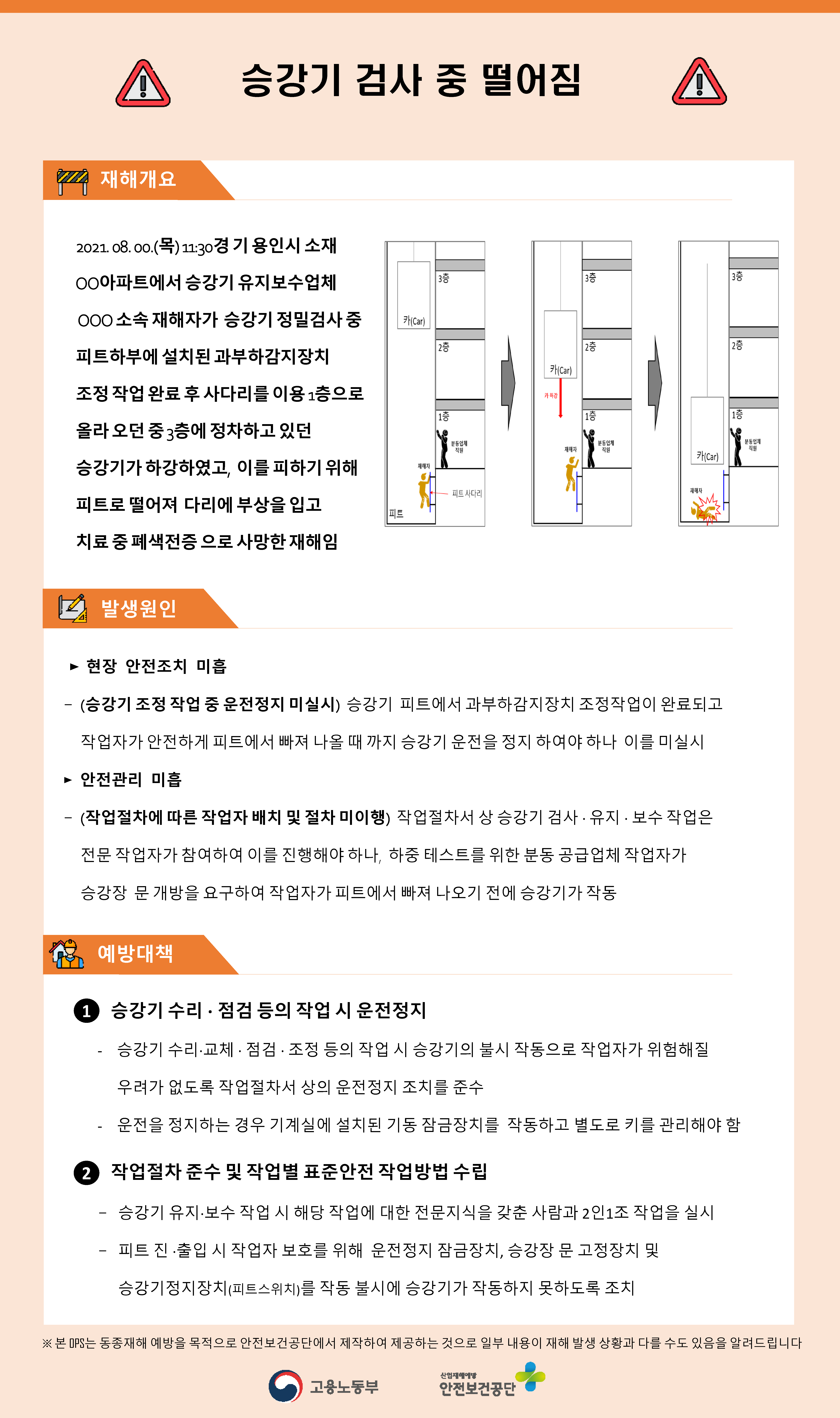 서비스업 재해사례 - 승강기 검사 중 승강기 불시 하강으로 작업자 떨어짐