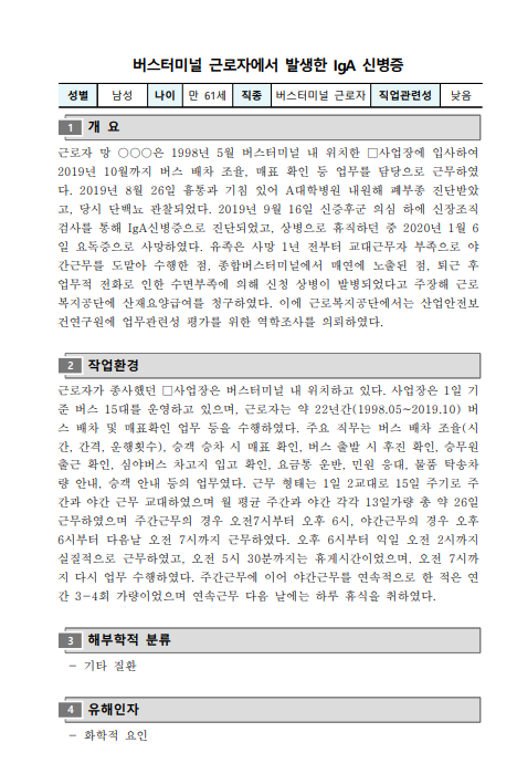 직업병 재해사례 - 버스터미널 근로자에서 발생한 lgA 신병증