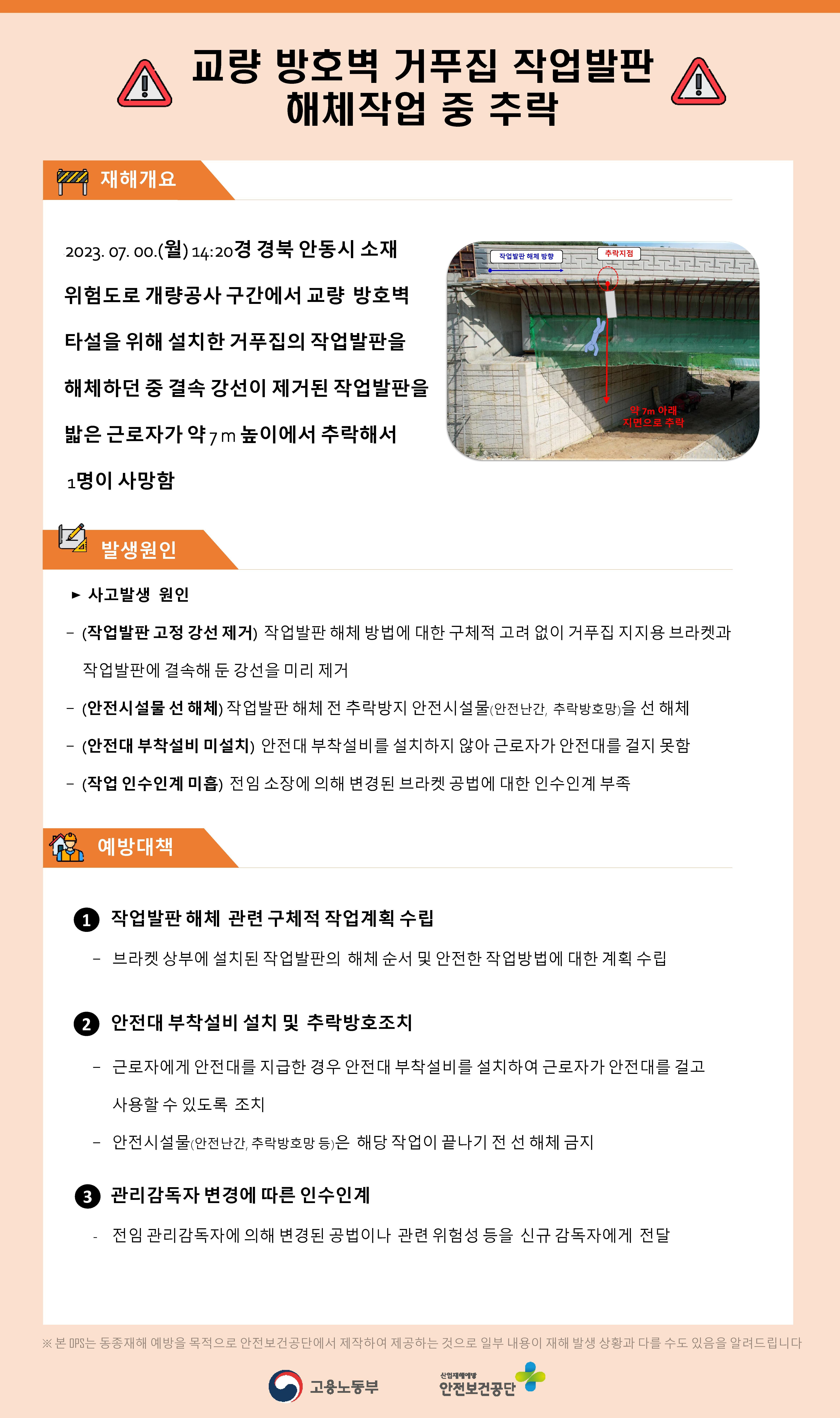 건설업 재해사례 - 교량 방호벽 거푸집 작업발판 해체작업 중 추락