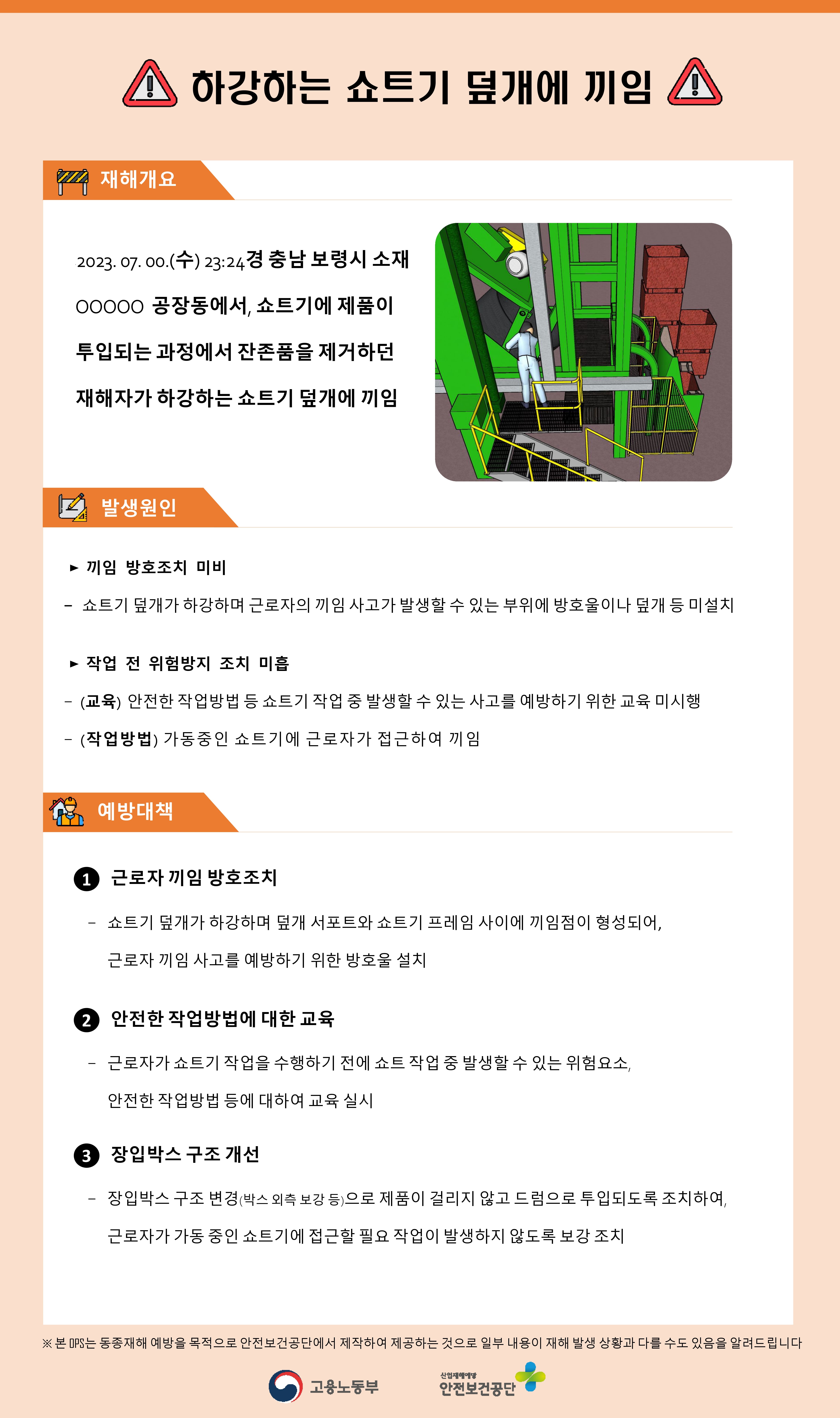제조업 재해사례 - 하강하는 쇼트기 덮개에 끼임