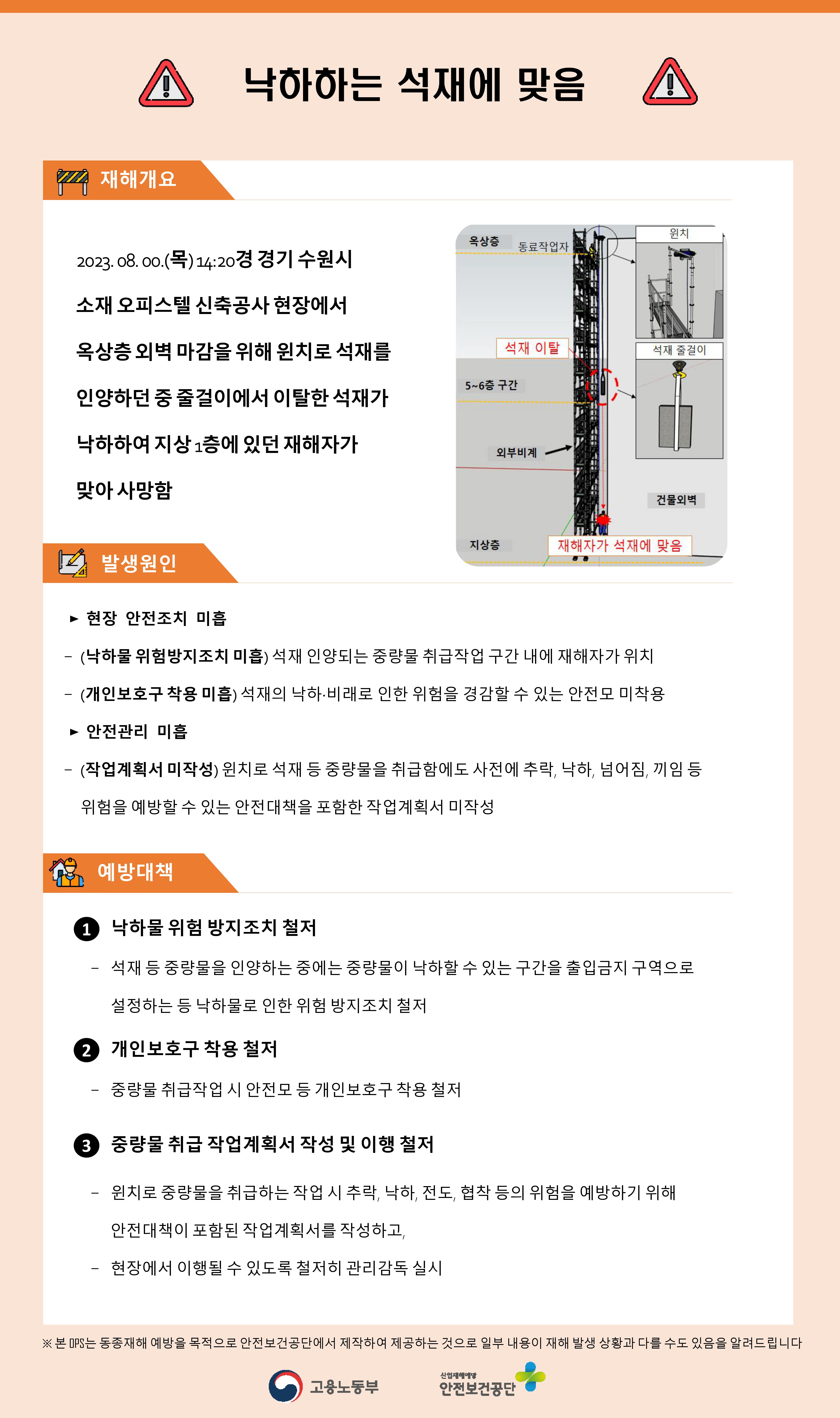 건설업 재해사례 - 낙하하는 석재에 맞음