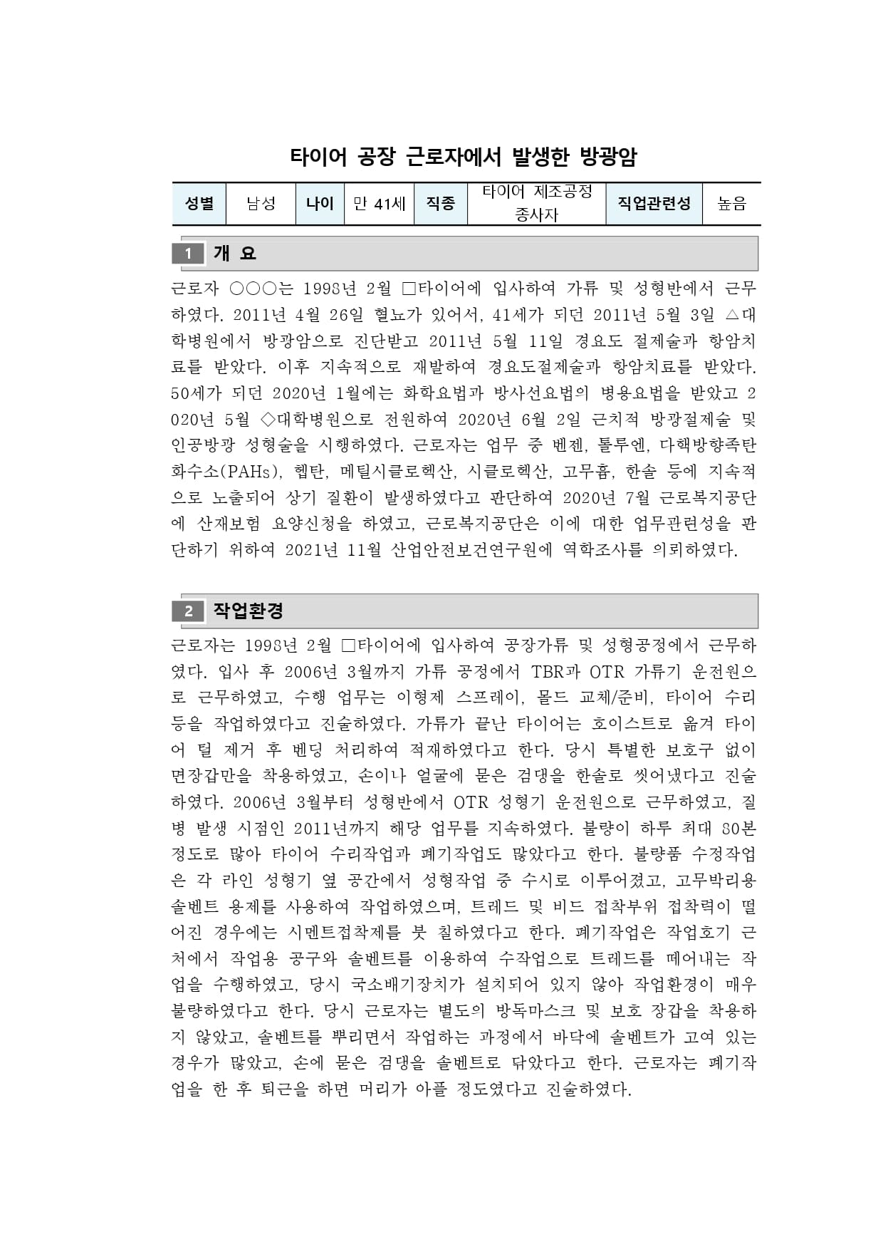 직업병 재해사례 - 타이어 공장 근로자에서 발생한 방광암