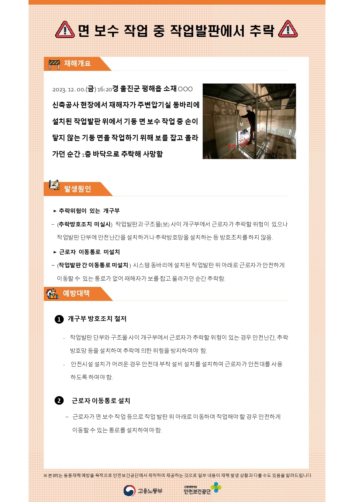 건설업 재해사례 - 작업발판 위에서 보수작업 중 추락