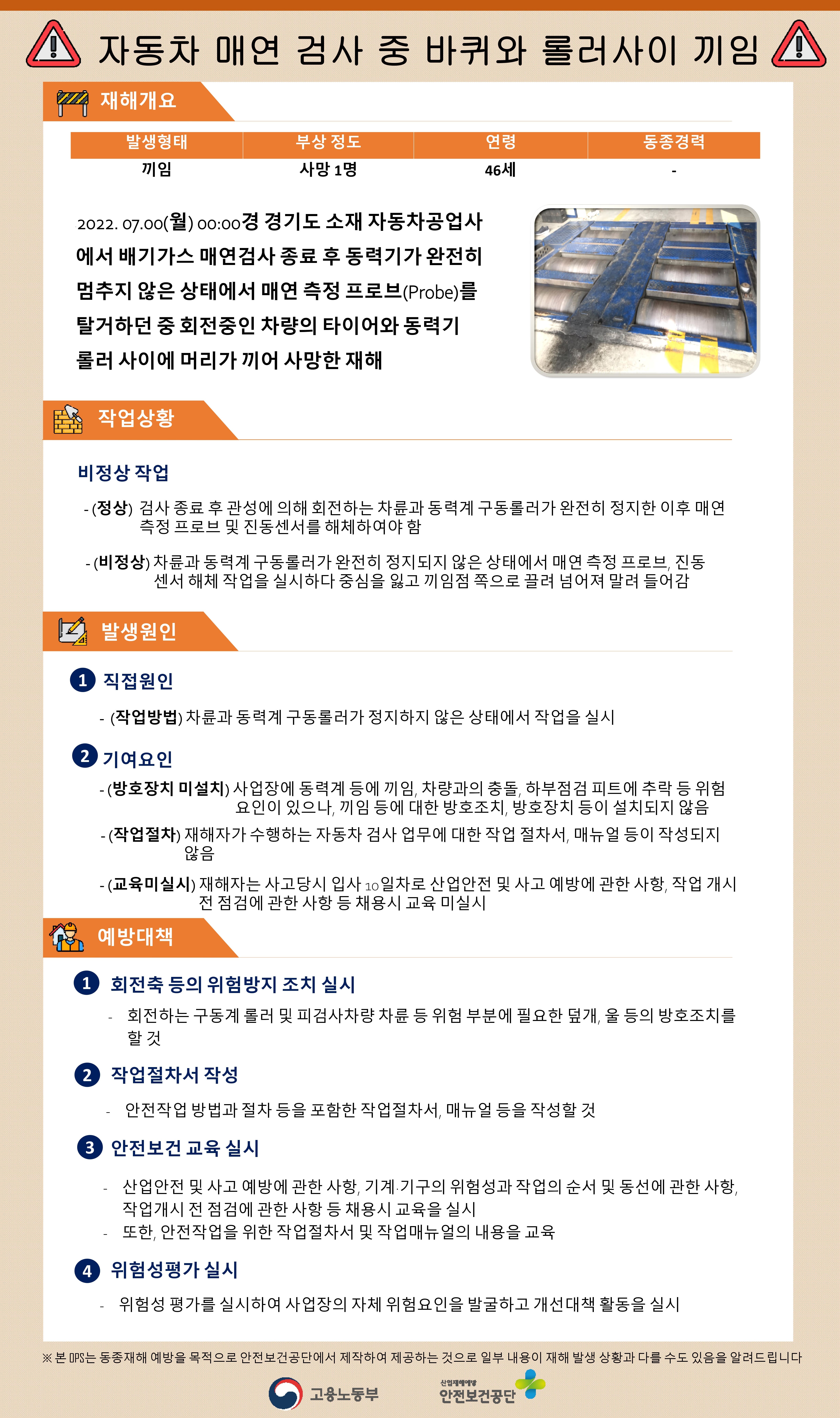 서비스업 재해사례 - 자동차 매연 검사 중 바퀴와 롤러 사이에 끼임
