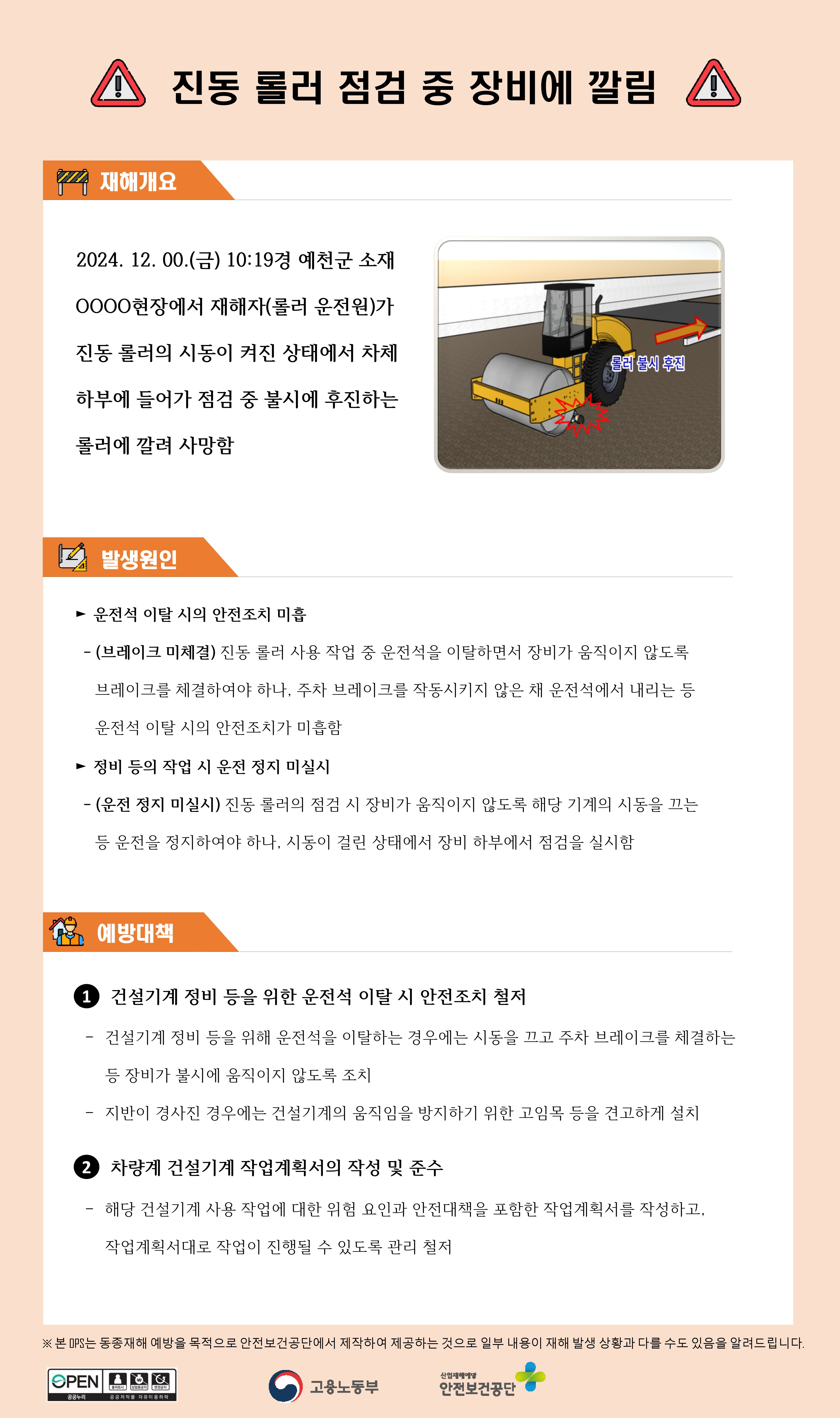 건설업 재해사례 - 진동 롤러 점검 중 장비에 깔림