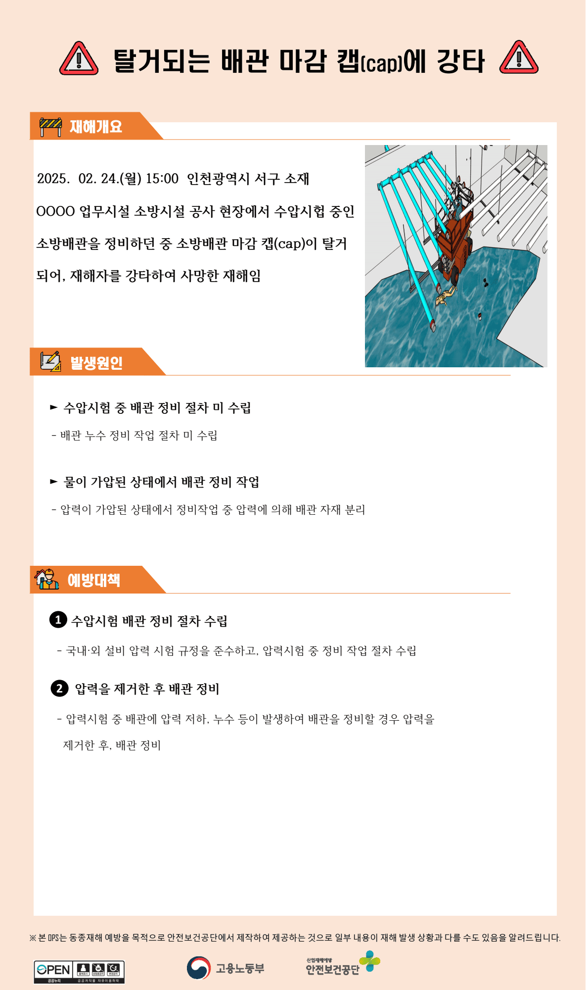 서비스업 재해사례 - 탈거되는 배관 마감 캡에 맞음