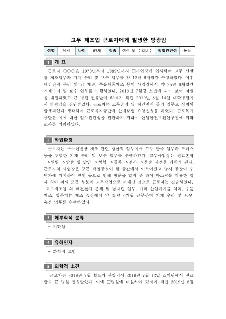 직업병 재해사례 - 고무 제조업 근로자에게 발생한 방광암