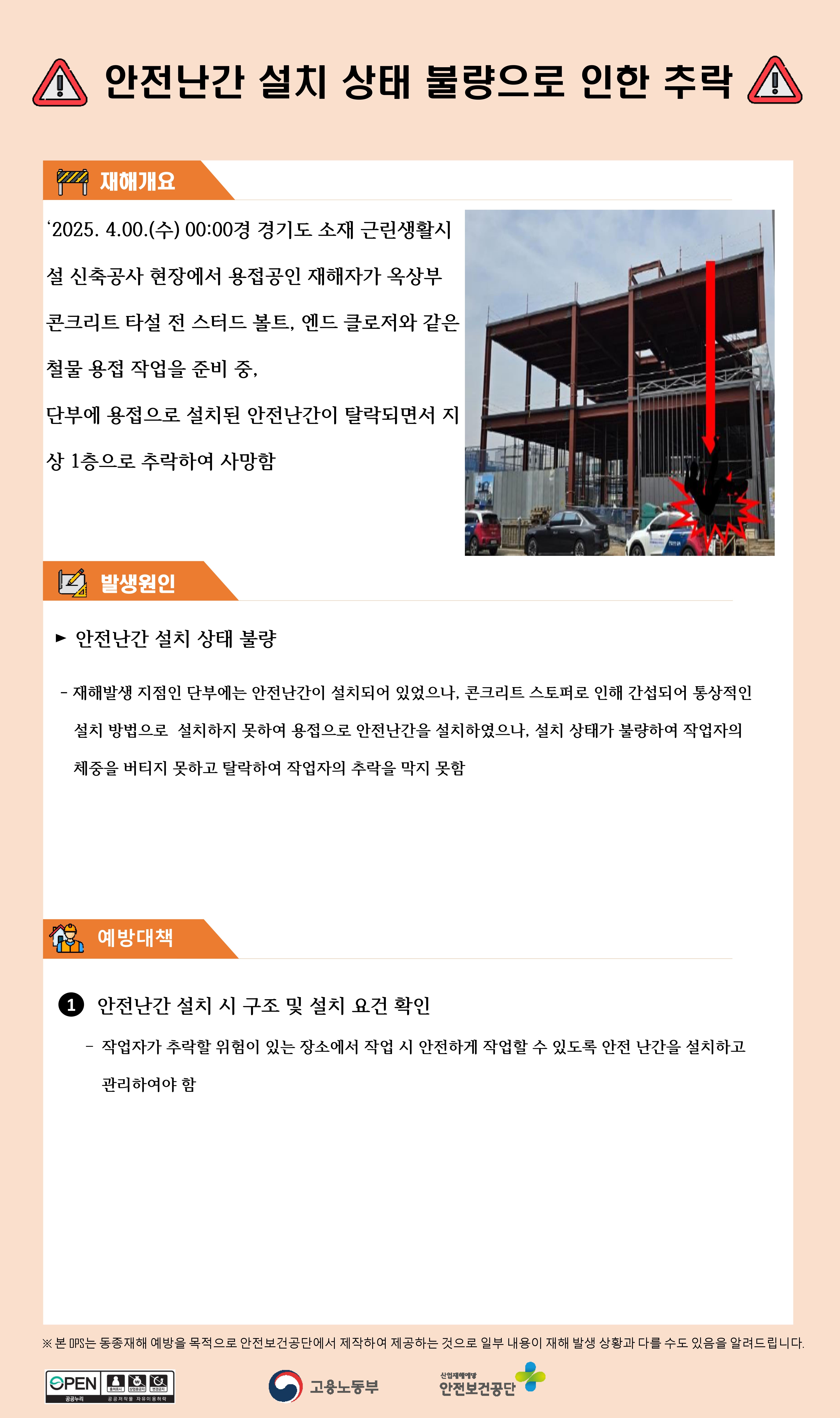 건설업 재해사례 - 안전난간 설치 상태 불량으로 인한 추락