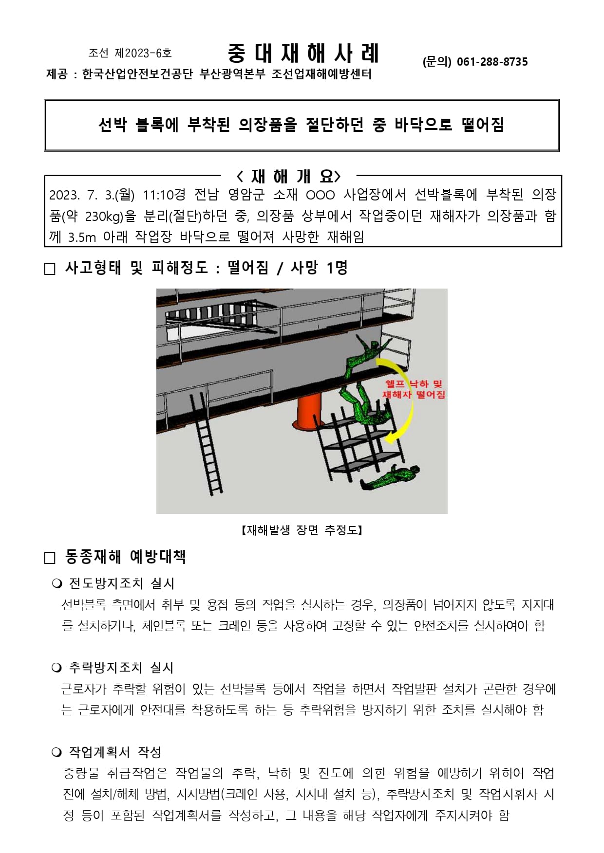 조선업 재해사례 - 선박 블록에 부착된 의장품을 절단하던 중 바닥으로 떨어짐