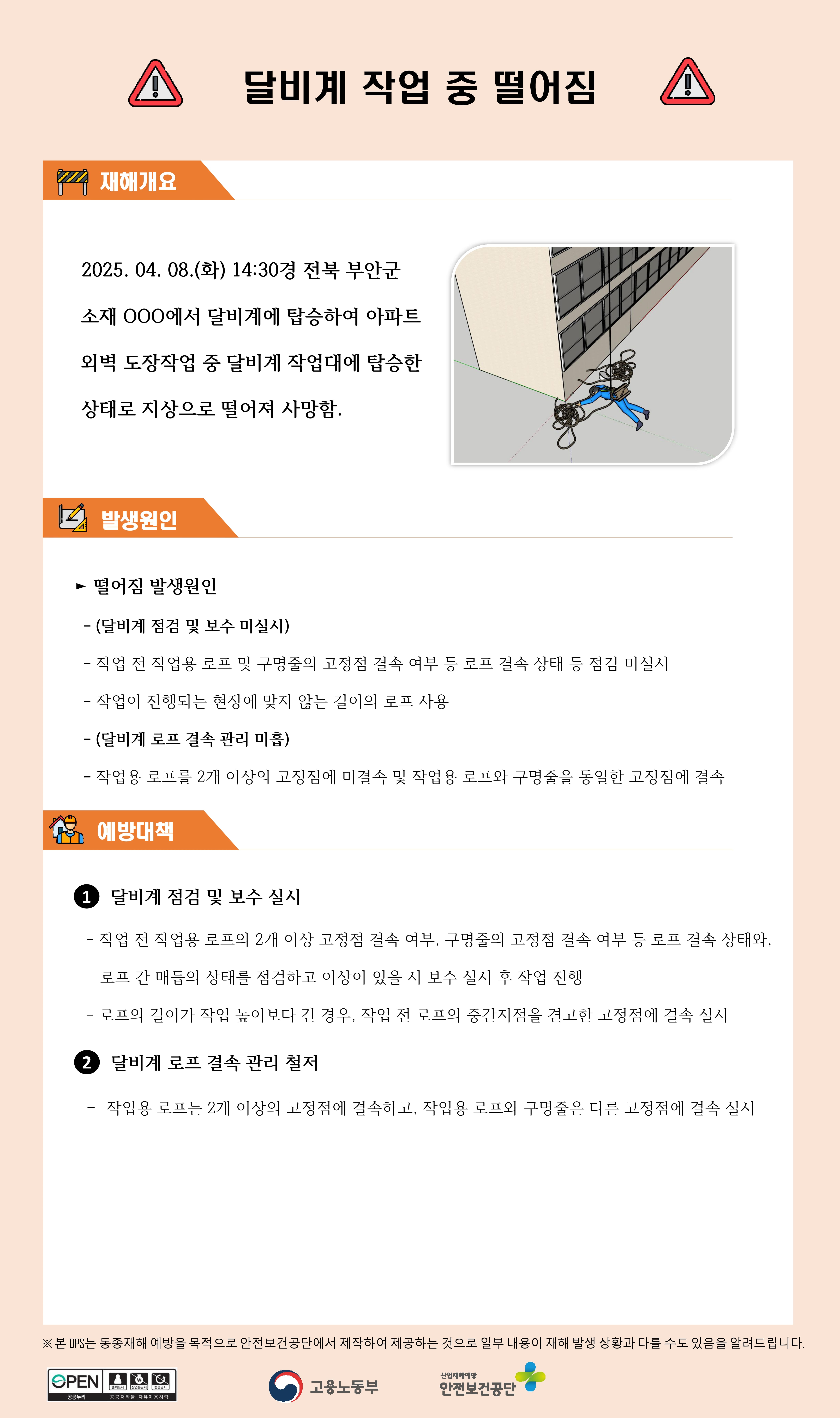 건설업 재해사례 - 달비계 작업 중 떨어짐